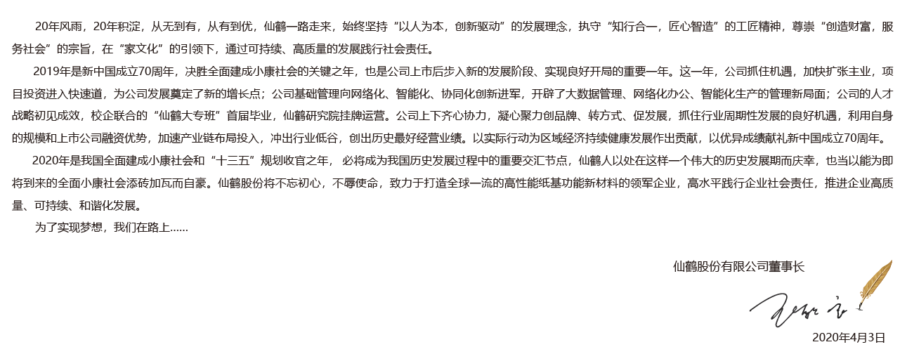 仙鶴股份有限公司將一如既往奉行“創(chuàng)造財富,服務(wù)社會”的價值理念,發(fā)揚“誠信、高效、創(chuàng)新、圖強”的企業(yè)精神,爭做特種紙行業(yè)的領(lǐng)軍企業(yè),為客戶創(chuàng)造價值,為員工創(chuàng)造福祉,為股東創(chuàng)造回報,為社會創(chuàng)造效益。